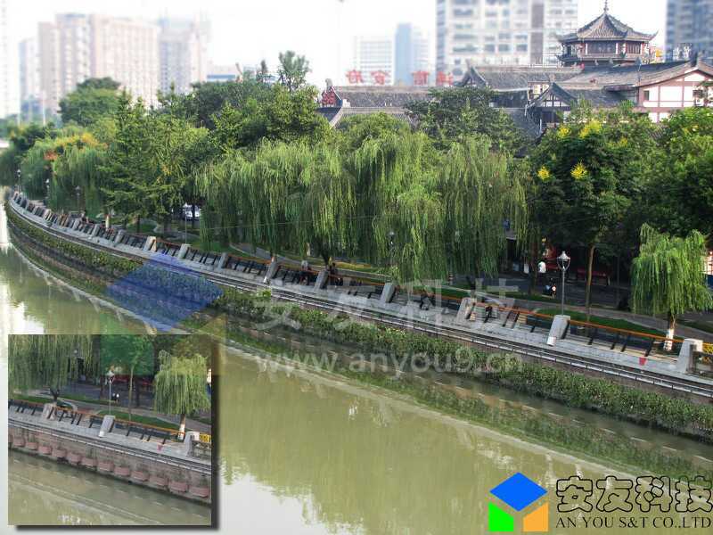 成都府南河河道綠化工程是成都府南河景觀綜合治理改造工程的一部分。由市建委、市重點工程辦牽頭,并由上海市政設計院設計。成都府南河曾多次做過河道綠化,但最終因各種原因失敗。此次針對多種方案進行篩選,多種材料的種植容器進行實驗、測試,最終選擇了安友沿口綠化系統。成都府南河河道綠化從2011年8月完成至今,效果良好,受到市領導和廣大市民的一致好評,成為成都市又一道靚麗的風景線。